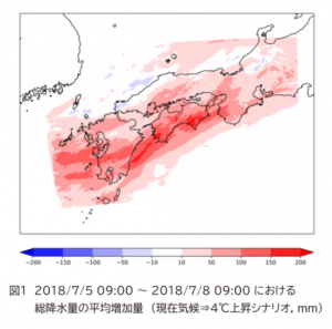 上記結果と、対象となる豪雨を気象モデルで再現したシミュレーション(このシミュレーションの結果を以下では「現在気候」とします)とを比較します。