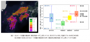 今回のシミュレーションでは、地球温暖化が進行した世界においては、現在よりも降水量が増加するとともに、河川流量の最大値(以下、ピーク流量)が増加する可能性が示されました。